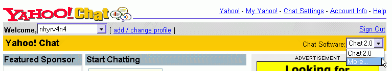 all logged in on the browser ? take a minute and notice a few things.... where your name is, you have a drop down menu to chose names, a link to add/change profile to add a new chat name, and a few options at the top for settings and account information. on the far right, notice the drop down for choosing chat software, you have chat 2.0 (dhtml) and the "more" option, which is the old java chat. - then just select a room from the list on the left and enter a chat room