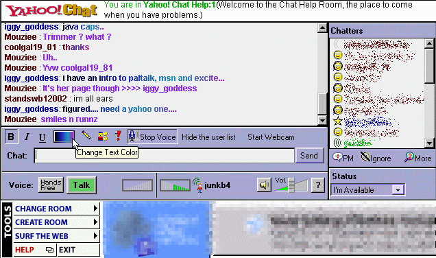 so you finally make it into a room ! the messenger option may look different, but the info is pretty much the same.... notice the buttons above the text line~ make your font bold, italics, or underlined, choose a font color or fade effect, open emotes, start or stop voice chat and web cam. take some time to look around, hover your mouse over options, try some right click options and when in doubt, ask someone...