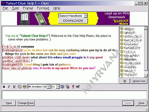 beta of yahoo messenger. the good......... this allows many to get around the firewalls at school and work and access chat, it has a larger screen than java chat . it has sound support and custom emotes . it has voice chat and supports all 65 of the new smileys. has text blends, now with webcams the bad......... there is still an error somewhere ~ that leaves messenger chat users susceptible to a code errors......also known as the 'boot. latest version is available is promoted as "less booting" ugh note the ad at the top......and when you open emotes and have voice open, your chat field is small. pop pms can be annoying if you forget to set to friends only. cant pause screen. some commands don't work.....
