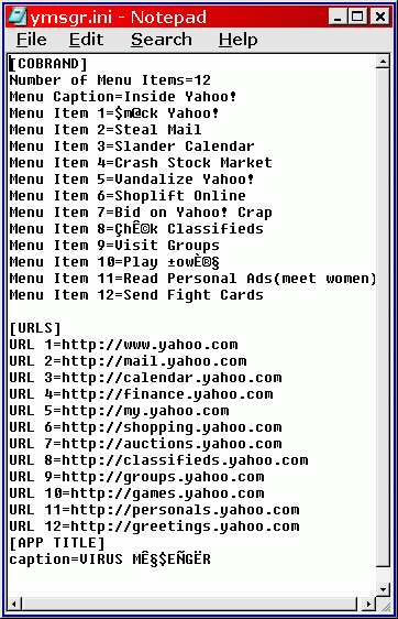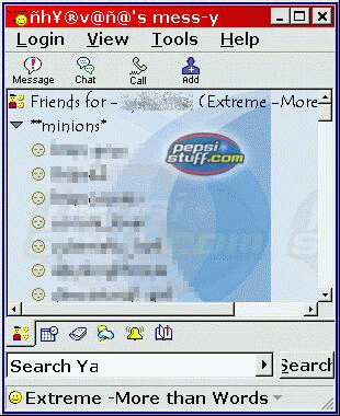 Winamp plug in this small plug in works with yahoo messenger and with Winamp. it sets the artist title and song name as your away status for messenger.  make sure you log in on main account id or it doesn't work :( oh oh oh..... and before everyone emails and asks how I got the custom info on the top line of messenger......, just edit the ymsgr.ini file. (note> this violates TOS :D but so does replacing smileys and just about everything else ) open it with notepad, and replace the info..... check the example >> ( dat's my buddy happy_virus's file.... he's weird..) and back you the file before you edit it, and before you update messenger if you like the changes make sure you have a caption AND a url ~ must be a set.... and keep the caption short, about the same length as the original.... and again, copy the ini file before you edit it!! |