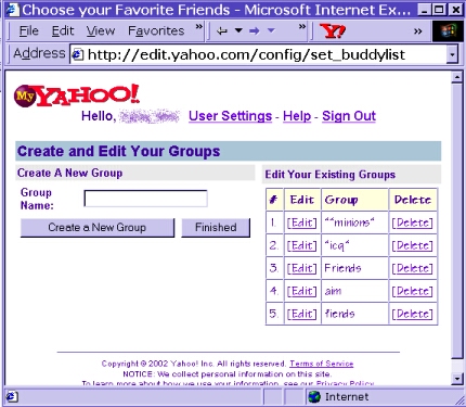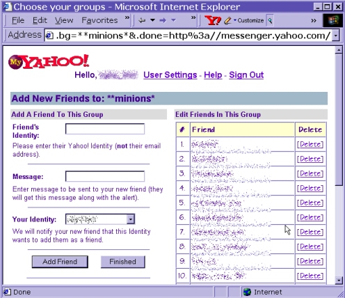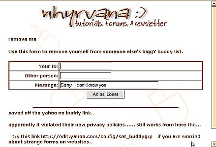 http://messenger.yahoo.com/edit/add/ and does NOT appear to allow you to remove your id from anothers list. i tested it with my own ids. i still see me ... but you can delete them off your list fine.... OPTION #2 person doesn't show on that edit buddy list? or want to just remove someone ? no muss no fuss? the old yah-whoooo nobud link is dead~ apparently it violated their new privacy policies...... still works from here tho... so, go log in on your account, (via mail or web browser, then go here /nobud2.html then just enter the id they added you under, their name, and a message...... click adios, loser and they are history! if it wont allow the delete.... try your other names on the account. occasionally someone will add you on their main account name, rather than an alias =o( and that makes them almost impossible to delete. |