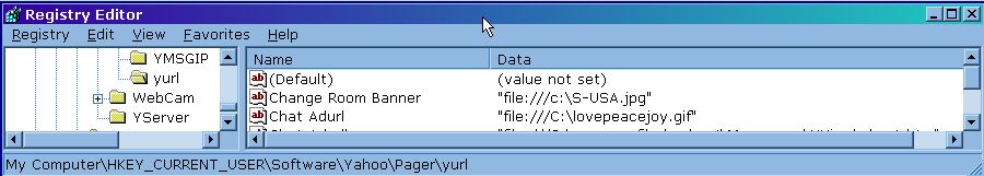 |  in this case, the key we were looking for was found at my computer, then click the plus sign to hkey_current_user, find plus sign to software, then click the plus sign and find yahoo, then in the pager folder.... then the yurl folder this is IMPORTANT! | the items you see with the little AB icons are registry keys. lets say you don't have one called Chat Adurl | * pouty face* then you would just right click the screen, and select NEW, STRING value.... and enter Chat Adurl. |  if you had a key like that, and want to change it... you could right click the registry key, and select modify. then enter something like.... file:///C:\blank.gif this is the image that will show now if you were to do all of this exercise... | if you wanted to use a one pixel by one pixel image.. just right click where it says file:///C:\blank.gif and select save target as, and drop it in your c drive. or use whatever other images you have on your computer...when done, *if* one were to do this.... might look something like below.... you could also repeat the exercise, to test your skills and understanding of this exercise by doing the same for Conf Adurl to test your skills :-) notice that it adds a border some.. so you do want to keep the image NARROW...
