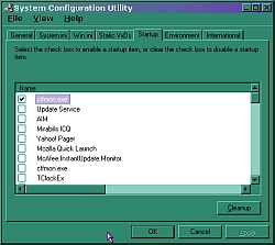 take a look at all the junk sitting down by the clock on your system tray? do you reallllly need all 4 messengers running at once? and real player? and winamp? and ....and.....and....????? so what can you clean from the tray? Any duplicate entries, which can cause system instabilities; anything from Real Networks (usually you'll see the RealPlayer StartCenter); any instant messaging software (unless you're an instant messaging junkie, if so get trillian of jabber ~ one program does it all ); and any jukebox or music software (Napster, for example, stays running in the tray even when you close the main application). Why get rid of these fun things? Because they suck up a lot of resources even when they're not running, and that slows down your work. ( not as much a worry if your all play on the comp, but still resource suckers!) Here's how to turn off system tray programs: Place the pointer over each tray icon; the Tool tip will help you determine what application each one represents. To shut them off, click or right-click each icon and select the option that turns it off--usually Exit. If right click doesn't give you a menu, press Ctrl-Alt-Delete, select the name of the program, and click the End Task button. or take a trip to msconfig and keep it from ever starting up with out permission. wait. not done yet! time to clear the files that are hogging space...... Disk Cleanup does some of the hard drive housework for you: It hunts down and clears out disposable files. open My Computer and right-click the icon for your main hard drive (usually labeled C:). Select the Properties option from the menu. In the dialog box that pops up, you'll see a pie chart that shows how much disk space you have free. Next to it, you'll see a button labeled Disk Cleanup. Click that button to run the cleanup utility, and Windows will find all of your disposable files--such as cached temporary Internet files, deleted files in the Recycle Bin, and (if you upgraded to this version of Windows from an earlier one) dozens of megabytes of uninstall files. All of those can be deleted to free up disk space: Place a check mark next to each item you're prepared to delete, then click the OK button and let Disk Cleanup do its stuff. Older comp? with no disc cleanup~ make sure to clear your temp files, recycle bin, and temp internet files. disc clean up can also be found on some comps by clicking start, accessories, system tools.... unused programs.  | PCs bought come with installed software often have lots of programs you don't want, and don't need!. The trick is to track 'em down and get rid of 'em. either uninstall via add remove in the control panel, or remove from msconfig. (Who needs all those screen savers?) use windows 95 ? use add /remove programs in control panel. don't forget to clean out any setup files from downloads. you can burn these to a cd if you have a burner... or my fave. upload to yahoo briefcase.
